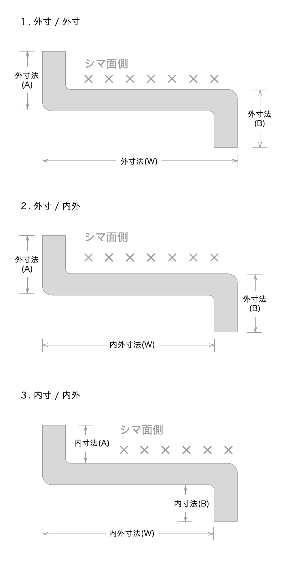- 外寸 / 内外 - 曲げ部AとBが外寸法、W部が内外(うちそと)寸法になります。