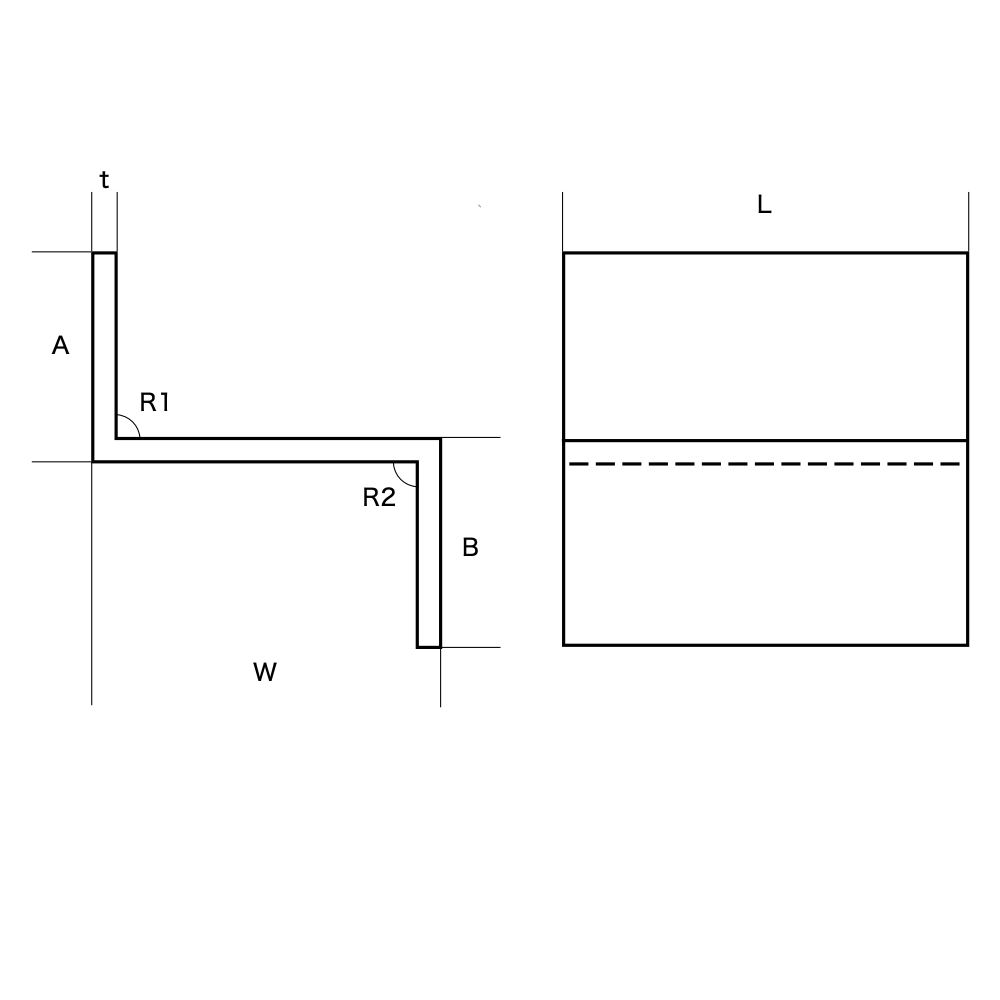 - 内寸 / 内外 - 曲げ部AとBが内寸法、W部が内外(うちそと)寸法になります。