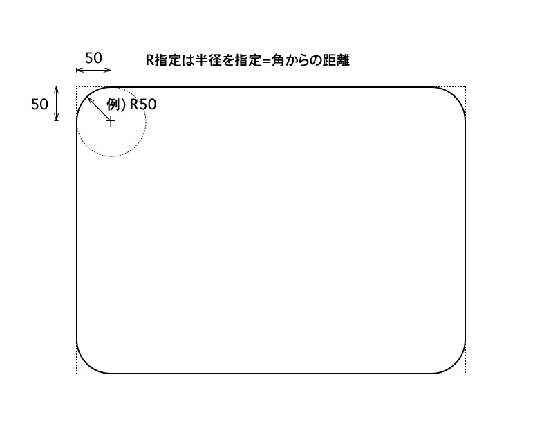 角Rは、 4つの角すべてが同じR寸法の場合のみ 指定可能です。