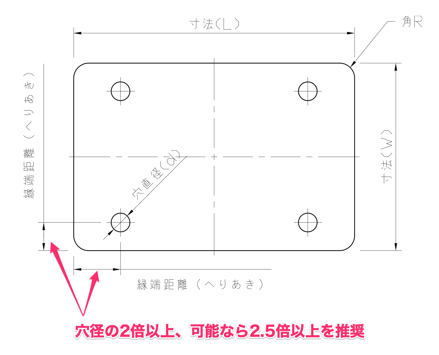 板厚・ボルト径・使用用途(建築・機械・アンカー用途など)に応じて、十分な余裕を持った位置指定をご検討ください。