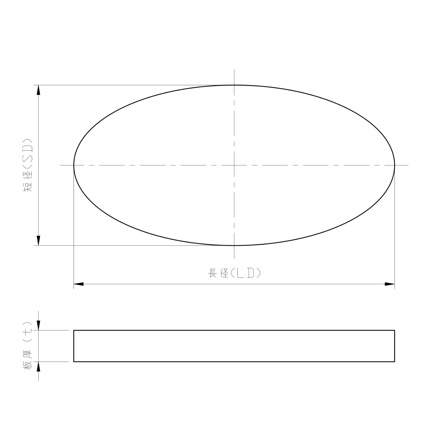 普通鋼板(SS400)を、ご指定寸法で楕円形状にレーザー切断してお届けします。短径(SD)と長径(LD)をご入力いただくだけで、図面不要でご注文いただけます。