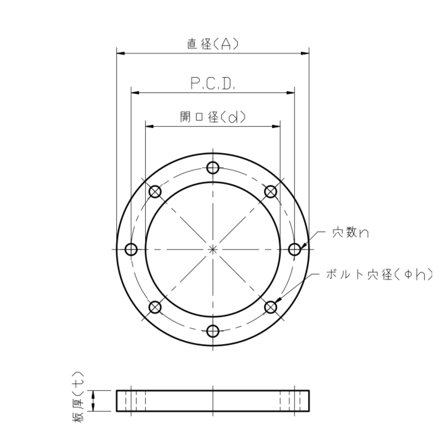 直径・開口径・PCD・穴径・穴数を自由に指定できるため、機械装置・設備・架台などの取付用フランジとしてご利用いただけます。